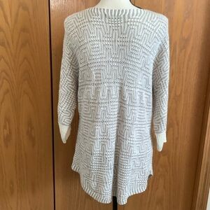 Grey and cream open knit lightweight pullover sweater with 3/4 sleeves. Sleeves have a cream wide knit band. Approximate measurements laying flat: bust 21” across from armpit to armpit, sleeve length 14” and length 27”. In excellent worn condition.