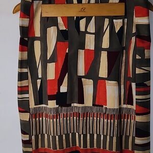 Abstract shades of plum, coral orange, olive wood, tan & beige
