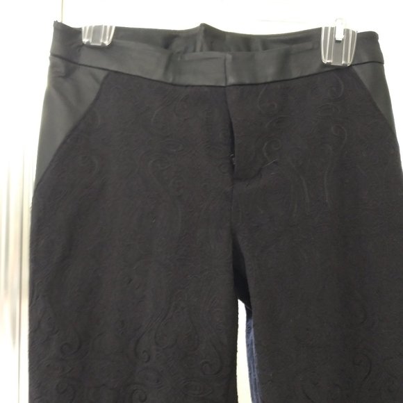 BLACK FABRIC WITH LEATHER TRIM ON POCKETS AND WAIST- GREAT FIT- NEVER WORN