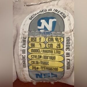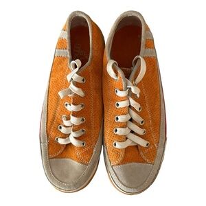 Style: Madrid Low. Orange sneakers with gray accents and white laces. Suede/Leather Upper. Women’s Size 9. Light Wear. Please Review Photos. Smoke Free Home.