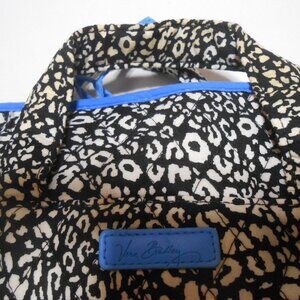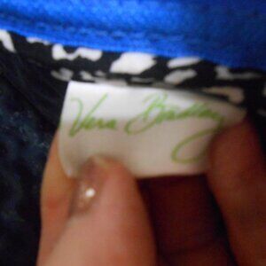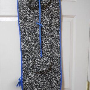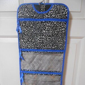 This is a Vera Bradley padded jewelry make-up travel organizer bag. This comes with many pockets and is a nice Vera Bradley travel organizer hobo style bag with handles and a metal hanger hook. Bag is black and white with blue trim and machine washable. bag measures 29 inches long by 11" by 2" width inches when folded. Bag is in very good pre-owned condition. All my items are shipped the same day that payment is received from a clean, smoke free, home!
