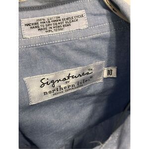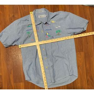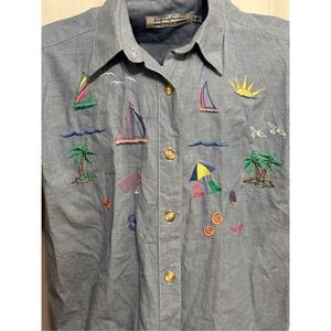 NICE WOMEN Signatures by Northern Isles tropical print chambray button down shirt 100% cotton. Embroidery is so cute and tropical. Good Condition