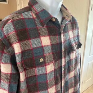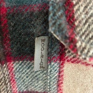 Made by Woolrich with thick wool plaid in red, tan, green and dark gray. Meant for layering for chilly days. Two breast pockets that button close. Classic, simple design, made to last. In excellent condition
