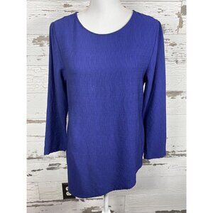 Niche by Nilgun Derman blouse features scoop neckline, 3/4 sleeves, and eye catching asymmetric hem. Perfect for everyday wear. Rayon/nylon blend. Worn once. Approx 18" armpit to armpit, 24" shoulder seam to high point of hem, 30" shoulder seam to low point of hem, 20" sleeves.