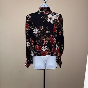 Chic 100% silk long sleeve blouse with vibrant floral pattern. Button up neck and bodice. Features a stylish keyhole neckline.