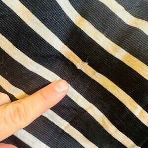 The top is likely made from a soft and warm wool blend in black and white colors. The stripes have a unique spiral design that adds visual interest.The collar is high and provides warmth and coverage.The sleeves are full length and may have ribbed cuffs.The top might have a slightly loose fit for comfort.