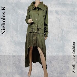 Discover the timeless elegance of the NICHOLAS K military Green Trench Coat, featuring a full-length design, full zipper and adjustable belt for a tailored fit. Crafted from 100% cotton,durable materials, this coat offers a relaxed, oversized silhouette perfect for layering in cooler weather.