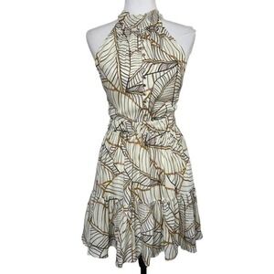 Stylish mini dress by NICHOLAS. Features a leaf print design. Halter neckline with a fitted waist. Perfect for casual outings.