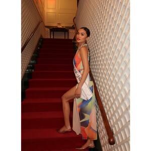 Nicholas Multicolor Abstract A-Line Bristol Gown in size 4 is a stunning choice for an effortlessly chic look. This gown showcases an eye-catching multicolor abstract print that blends artistic flair with timeless elegance. Designed with a flattering A-line silhouette, it features delicate ruching along the bodice, enhancing the figure while providing a touch of texture. A daring side slit adds movement and a sultry edge, making it perfect for formal events or evening soirées. Crafted from a lightweight, breathable fabric, this gown ensures comfort throughout the night.