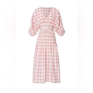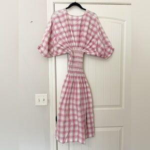 Pink & white gingham woven (100% Cotton). Hourglass. Short sleeves. V-neckline. Exposed front button closures. 51" from shoulder to hemline.