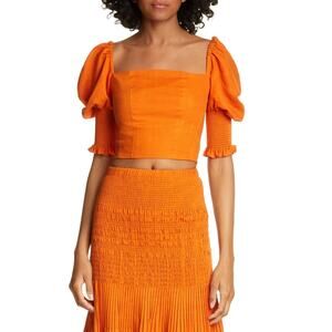 This striking bustier crop top from NICHOLAS blends vintage-inspired romance with modern tailoring. Cut in a rich deep orange woven fabric, it features a structured bodice with pouffy leg-of-mutton sleeves for statement volume. Smocked flounce cuffs add a soft feminine finish, while the cropped silhouette makes it perfect for pairing with high-rise denim or skirts.