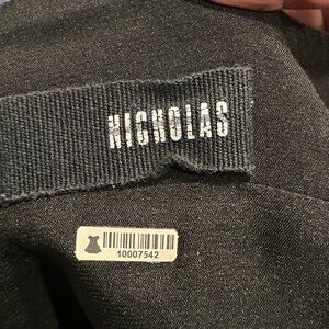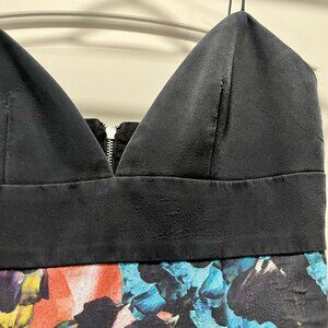 Preowned in good condition with some minor flaws. Size 0. Main: 100% silk/ contrast: 72% polyester, 23% viscose, 5% spandex/ lining: 95% polyester, 5% elastane. The left spaghetti strap is slightly frayed and some loose thread at the top of the slit, See pics for details.