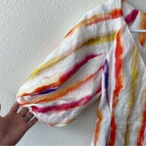 Inspired by vibrant destinations, and sun-kissed leisure days by the water, we created the Brushed Rainbow print. The Shaanti dress, a canvas for this painting, is made from pure linen with a V-neck and back, puff short sleeves, a fitted waist, a flared skirt and a mini length. Match with sneakers and a crossbody bag for daytime and swap for heeled strappy sandals after-dark.