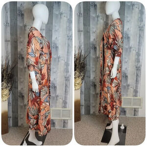 Orange printed linen (100% Linen). Hourglass. Three-quarter sleeves. V-neckline with tie. Hidden center back zipper with hook-and-eye closure. 50" from shoulder to hemline. Imported