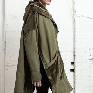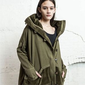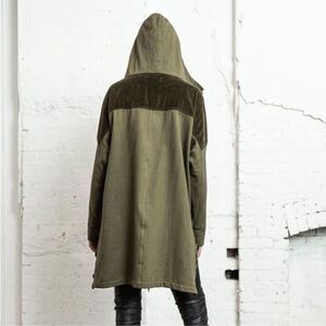 An oversized sweatshirt jacket with velvet details, zip and button closures, and front pockets.
