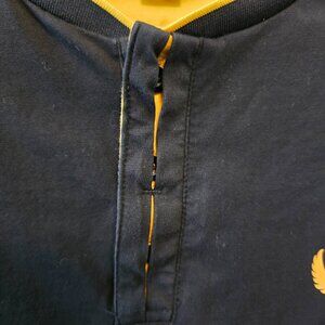 NAME: NICK DANGER BLACK GOLD MENS TSHIRT SIZE LARGE TRUE TO SIZE SOFT STRETCH SHORT SLEEVE HENLEY TRIM FLEX FIT CASUAL OFFICE WEEKEND WEAR EASY GOING