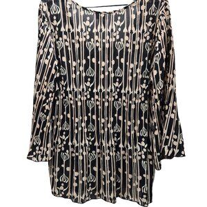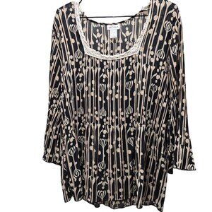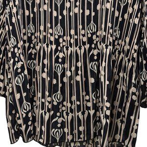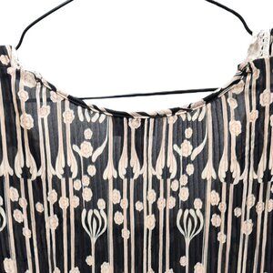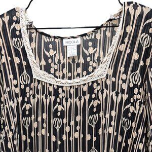 NICOLA BLACK & CREAM BOHO STRIPED FLORAL PRINT LACE NECKLINE FLARE SLEEVES TOP L