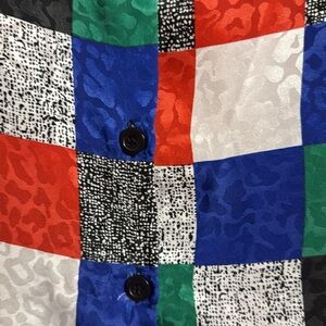 Fun retro Nicola Fenetti blouse. Bold checkered pattern with red, blue, green, and black. Short sleeves. Eye-catching design.