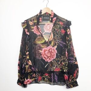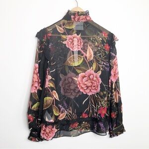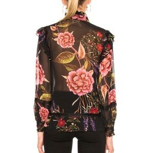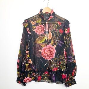 Nicolas Peony black floral ruffle sheer silk blouse with keyhole front closure.