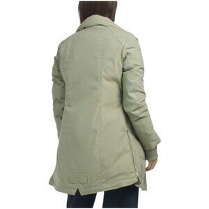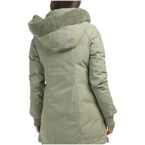 shearling trim, 2 front button pockets, side zip vents, ribbed cuffs, removable zip hood