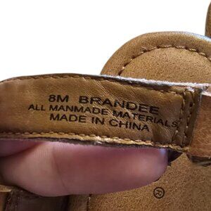Very cute brown sandals with a cork wedge heel by NICOLE. Braided man made material. Good preowned condition. There are a couple of small scuffs shown in the last 3 photos.