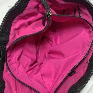 Nicole By Nicole Miller Black Faux Debossed Leather Tote with Magnetic Snap closure. Front and back and both sides have a zipper pouch. Wear around handle attachments. Marks inside of liner. See photos.