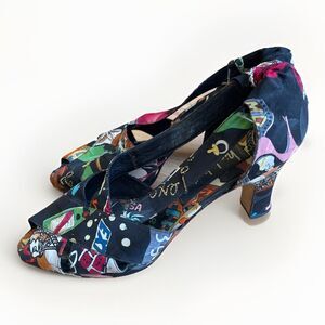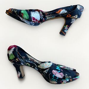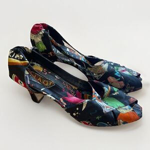 NICOLE MILLER Artelier Shoes Pop Art Print 100% Silk High Heels Pumps Sz 8.5 Vtg