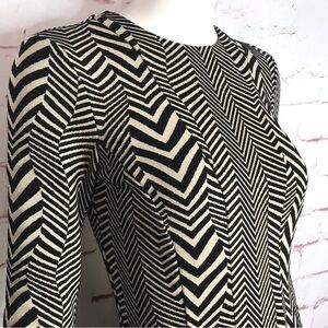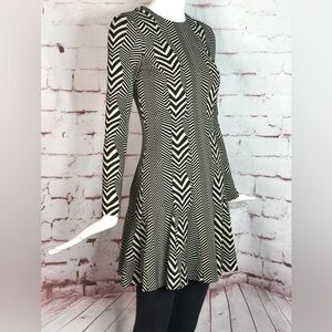 Wow them with this fabulous Geometric Chevron design fitted A-line skater skirt dress by Nicole Miller. Knit dress has substantial weight - perfect for cool weather! Smashing with black tights! Size is P - Petite 70% Viscose 29% Polyamide 1% Spandex Thick stretchy knit Black & Cream Long sleeve Full hidden back zipper Excellent condition ! To insure best fit please compare my measurements below ⬇️ with your own dresses Measurements laying FLAT unstretched are approximate: • Pit to pit 15” • Width at waist area 12.75” • Length from mid shoulder to bottom 33” • Sleeve length from shoulder seam 23.5”