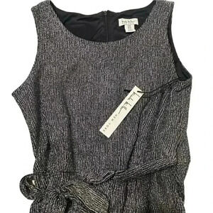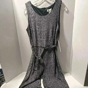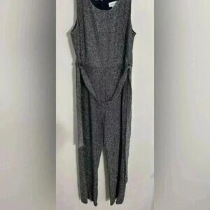 This Nicole Miller jumpsuit is a stylish one-piece outfit designed for women. It features a shimmering metallic fabric in gray, perfect for party or cocktail occasions. The jumpsuit has a belted waist and an open V-back, adding a touch of elegance. It is sleeveless and comes in a regular size M. Ideal for evening events or special gatherings. The item is new with tags. Keywords: Nicole Miller, jumpsuit, women's fashion, party wear, cocktail attire, metallic fabric, belted waist, open V-back, sleeveless, gray jumpsuit, size M, new with tags, evening wear, stylish one-piece, women's clothing.