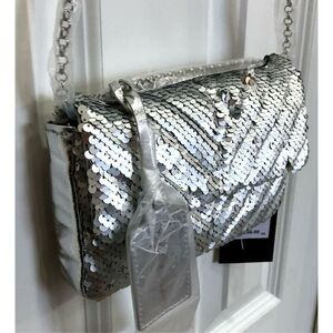 This bag will dazzle! This is Nicole Miller's Silver Sequined and Vegan Leather Evening Bag. She's 8" x 5" x 1.25", with an adjustable sliding chain strap shown at 22". Strap can double so it can be worn as a shoulder bag. Quilted chevron-patterned sequined bag with 1/2-sized front flap, secured by two magnetic snaps. Matching sateen lining with 4 card slots and Nicole Miller tag. MSRP $50. This is a gorgeous bag, new with tags. Hardware is still wrapped in plastic. Sparkly and adorable and NWT!♥️