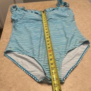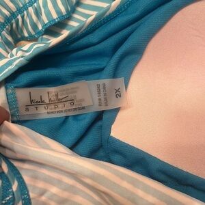 Beautiful suit size 2X , 2 small areas on hip of chlorine discoloration shown in pic but hardly visible would need to be pointed out in person . Built in bra lined not wired . Can be worn on or off shoulders