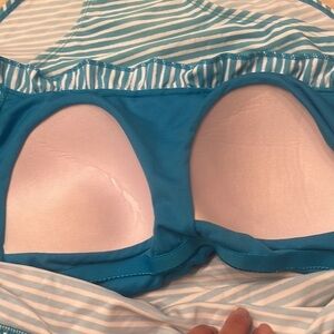Beautiful suit size 2X , 2 small areas on hip of chlorine discoloration shown in pic but hardly visible would need to be pointed out in person . Built in bra lined not wired . Can be worn on or off shoulders