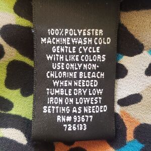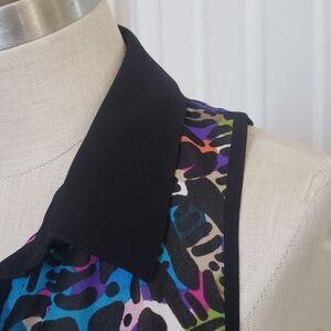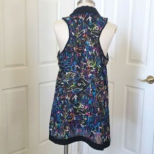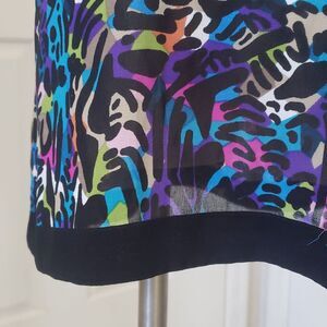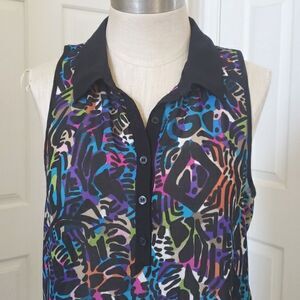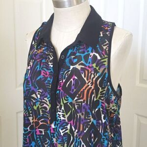 Fun, colorful print in a lightweight, dressier fabric. Black, blue, turquoise, lime green, pink, purple, orange... visually cool color palette. Sleeveless, Racerback, contrasting black collar and hem, button down. Longer, tunic length. Wear it with leggings or skinny jeans... or fabric is even thin enough, you can even tuck it in) pit to pit 19" Length 31" Excellent condition.