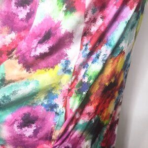 The gorgeous Nicole Miller Watercolor Satin Maxi Dress in XL size is a stylish and elegant choice for parties or cocktail or any special events. The dress features a strap design with a V-neckline and a pullover closure. Made of polyester and spandex, this long dress in a vibrant multicolor print has a luxurious satin fabric that adds a touch of sophistication. With a floral theme, this dress is perfect for the summer and spring seasons, and it also has pockets for added convenience.