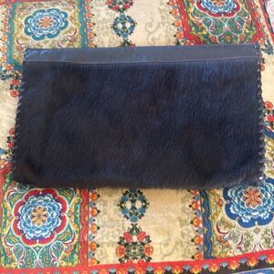 NICOLE MILLER black pony hair clutch with gold triangle leather and detailed stitching. In good used condition. See pics. Interior zipper pocket, key chain holder and pen and small pocket.