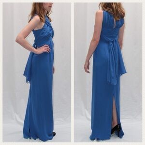 Nicole Miller Collection Floor Length Royal Blue beauty. Very versatile. Can be worn multiple ways - strapless, cross in front (see pictures) cross in back, cap sleeves, empire waist, straps tied in back, tied in front, etc. slit in back, long train. Hemline shows signs of wear. 100% silk. Two attached chiffon veils in back (that get criss crossed, tied or worn long, etc). Polyester lining. Should be dry cleaned.