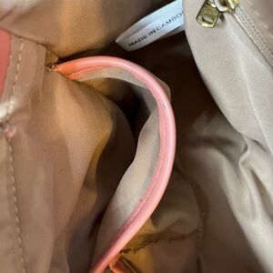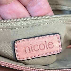 Nicole Miller dusty rose pink faux leather handbag with adjustable and removable crossbody strap. Top zip closure. Interior zip pocket and 3 open slip pockets. Exterior snap closure pocket. Slight damage to the crossbody strap and to the handle. Please see as show in photos.