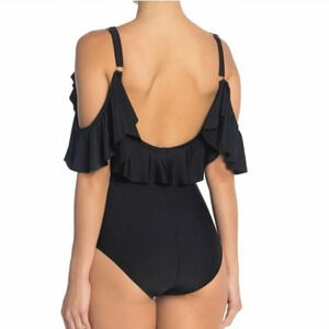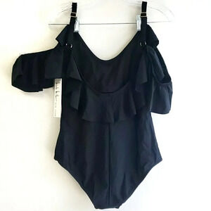 A charming ruffled one-piece swimsuit features trendy cold shoulders and a scoop back for beach-friendly style. - Scoop neck - Adjustable straps - Cold shoulder ruffles - Shelf bra - Removable soft cups - Scoop back - Ruffle trim - Lined - Moderate coverage
