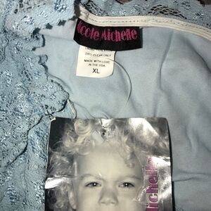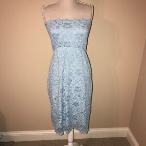 The Strapless Blue Lace Dress is a formal maternity gown - great choice for your bridal shower. The pull on strapless lacy dress features sexy, stretchy lacy overlay with a blue liner underlayer. Comfortable and beautiful, you will feel confident as a bridesmaid or a guest in this stunning outfit. Dry Clean Only. Designed to be worn during and after pregnancy. By Nicole Michelle Maternity BNWT. Will fit 6-10. RUNS SMALL. Bodice to hem 33"