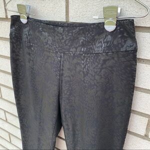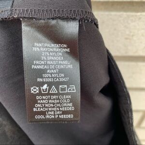 Woven pant. Wonderstretch. Embossed design on fabric. Sits at waist. Pull on. Straight. Full length. Pant: 76% Rayon, 21% Nylon, 3% Spandex. Front waist panel: 100% Nylon Size 4P. Excellent used condition.