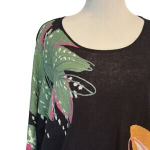 Palm leaves and flowers bring tropical garden-party flair to a soft sweater with slouchy short sleeves.