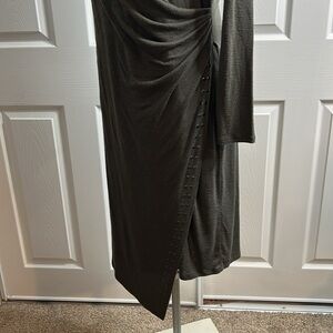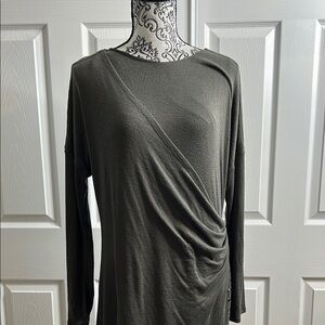 This sophisticated gray brown dress from NIC+ZOE features an asymmetrical ruched design, offering a contemporary and versatile style. The long sleeves and soft, stretchy fabric ensure a comfortable fit, making it perfect for both casual and dressier occasions.
