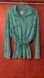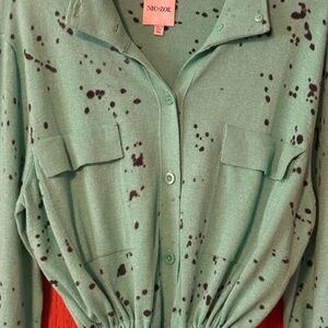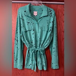 Stylish green cardigan with black splatter pattern. Features button-down front and drawstring waist. Perfect for versatile wear.