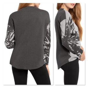 An abstract foliage pattern covers this drop-shoulder sweater styled with triple-button cuffs and a scooped back hem.