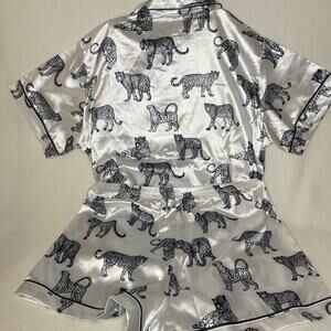 NIGHT Brand Lounge able Satin Pajama Shirt Set With Leopards - Size 10 NWT