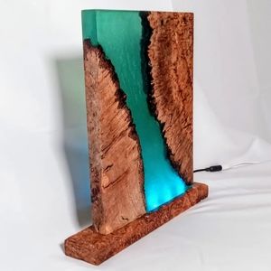I handmade this piece from Oak burl and epoxy. I used a LED light strip that comes with remote. LED light is multicolored and programmable. plugs directly into 110 socket.