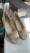 New in box pair of ladies size 8 slip on open toe wedges -- perfect for wedding, cruise, dinner outing, fun! Who says the mature woman can't dress in stylish charm: This pair is champaign canvas with a touch of glitter bling! These lovely open toe wedges provide sure footing with skid resistant outer soles.