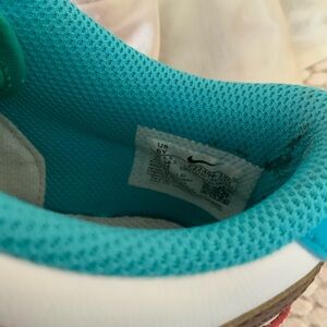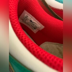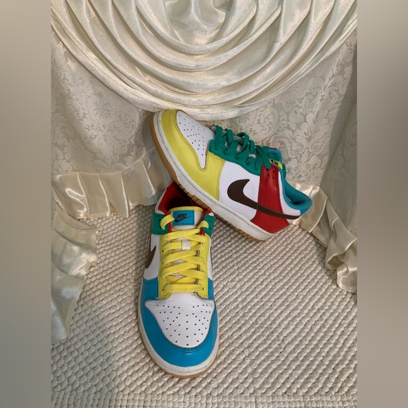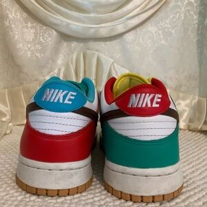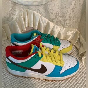 NIKE DUNK LOW S E FREE-99 WHITE TURQUOISE GREEN YELLOW RED ..BROWN LEATHER NIKE SWOOSH FEATURING MISMATCHED, MULTICOLORED OVERLAYS, LEATHER SNEAKERS, MISMATCHED COLOR BLOCKING BETWEEN THE LEFT AND RIGHT SHOES UNISEX SIZE 6Y BIG BOYS