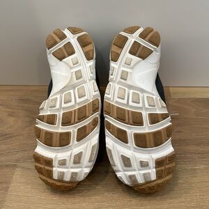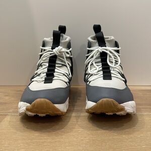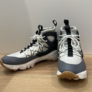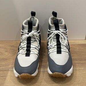 Features: high tops, sock ankle, lace up, two toned gray and white, leather upper, Nike air,