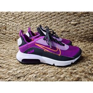The product is a pair of Nike Air Max 2090 athletic shoes in a vibrant violet frost color, suitable for both youth size 4 and women size 5.5. These lace-up shoes are designed for comfort and breathability with a cushioned heel and mesh upper material. Perfect for various activities such as gym, track, running, and yoga, they offer a colorful and athletic style suitable for young kids and women on the go.